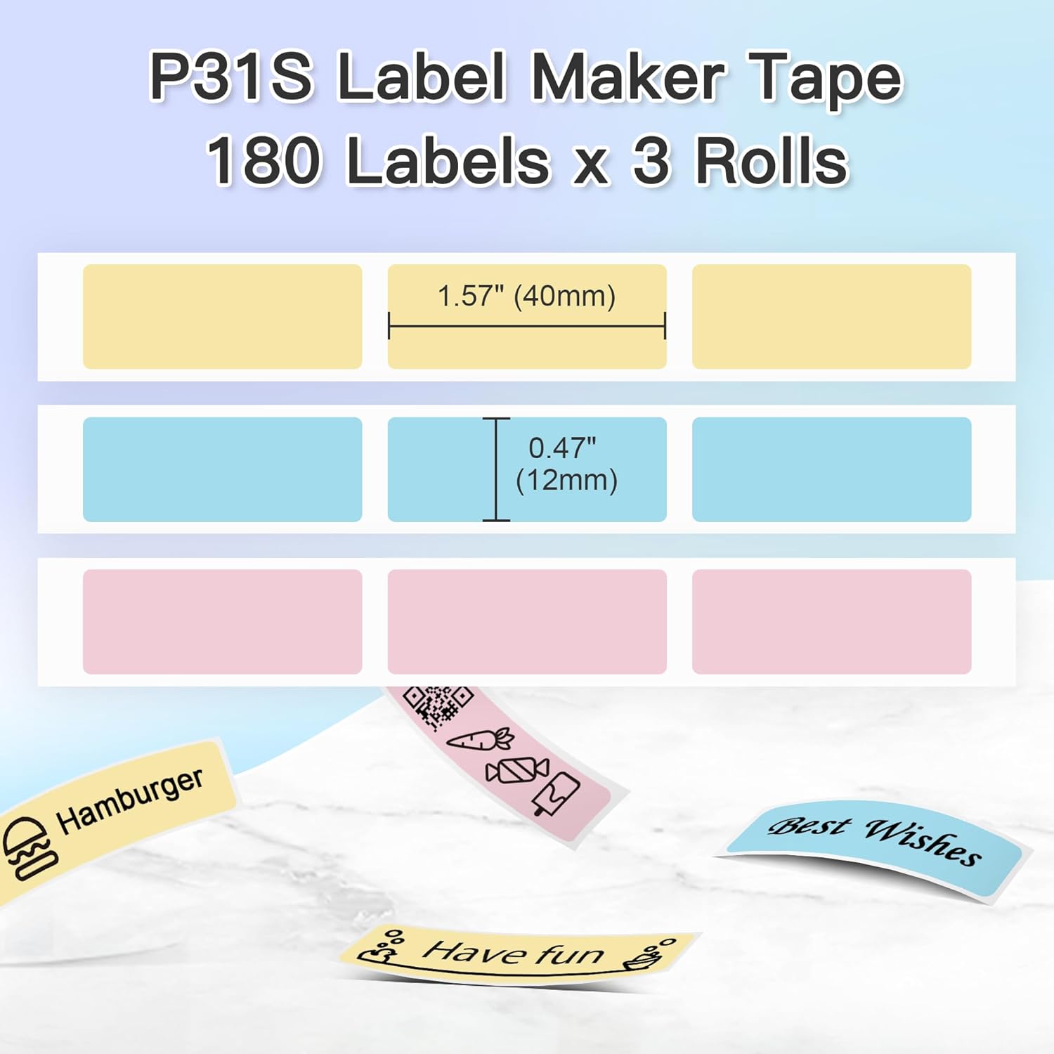 - [Genuine Label Maker Tape] Genuine Label Maker Tape for POLONO P31S Label Maker. Belongs to the standard laminated label paper and adapted label printing paper. Specification: 12x40mm (0.47"x1.57"), 540 Labels/3 Roll, Pink/Blue/Yellow